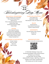 Gather with family and friends this Thanksgiving for a delicious, chef crafted buffet at Reserve 22. Enjoy a warm and welcoming atmosphere, festive flavors prepared by Chef Tom and a feast to remember, without the cleanup. There will be three specific seating times with a 2 hour time limit on the table. 11am, 1:30pm and 4pm will be the seatings you can book on opentable.com or through the reservation link on our website. Any parties larger than 10 guests will be seated at separate tables and we will do our best to keep the tables close to each other. Adults - $57.99 Children (5-12) - $22.99 Children 4 and Under: Complimentary There will a $10 per person No Show/Cancellation fee for any changes made within 48 hours of Thanksgiving. If you have any questions about the meal, please call our restaurant - however reservations need to be made online and secured with a credit card.